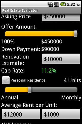 Real Estate Evaluator apk | Enter the asking price for the property you're looking at, and quickly you can see what you should offer to make it profitable enough to interest you. Also great when looking at a home for yourself to ensure you aren't overpaying compared to renting.